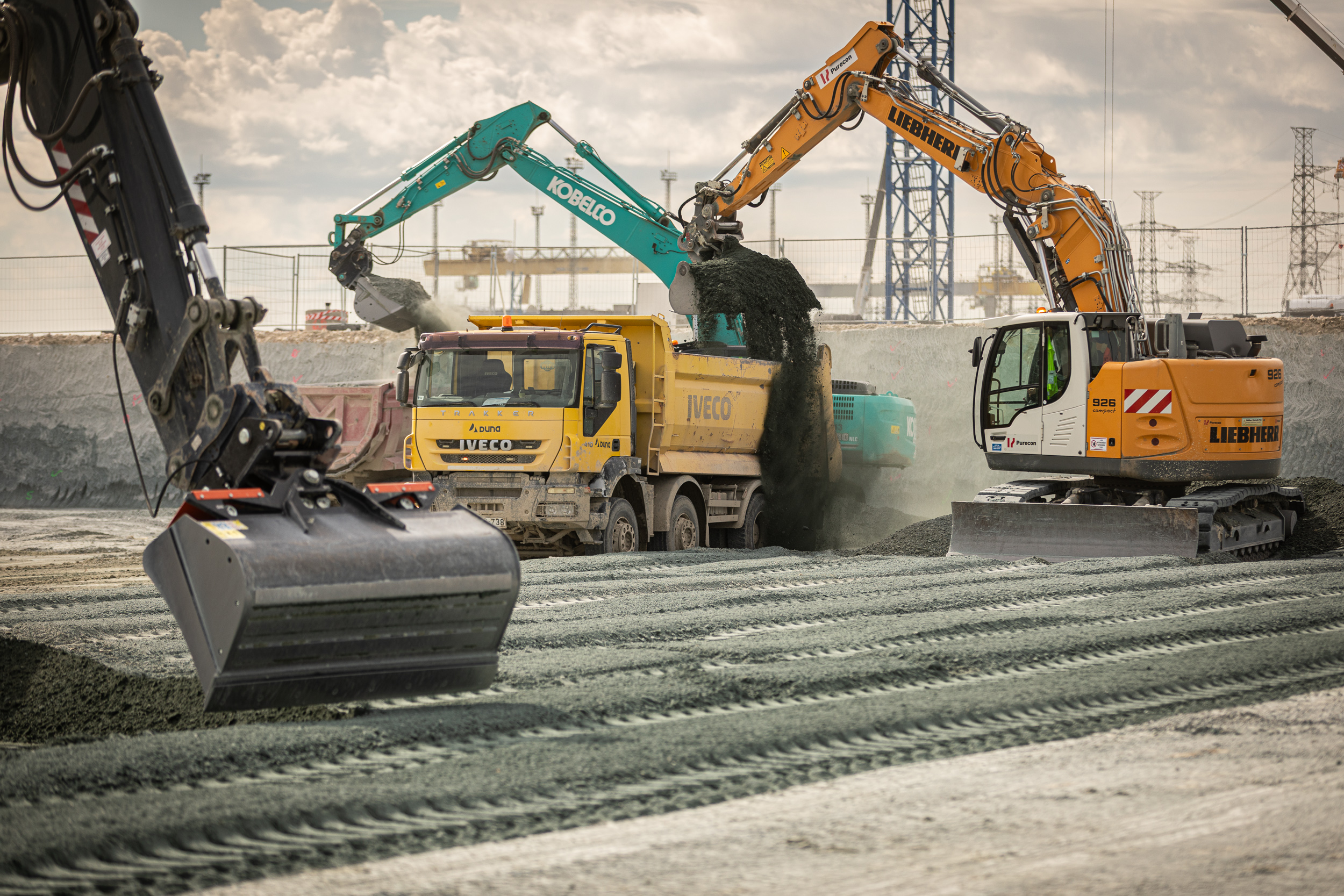Eközben a 6. blokk területén talajmarók, lánctalpas kotrógépek, dózerek és teherautók dolgoznak a 150 méter széles és 190 méter hosszú, 23 méter mély munkagödör kialakításán, a hozzávetőleg félmillió köbméter föld több mint negyedét már kiemelték.