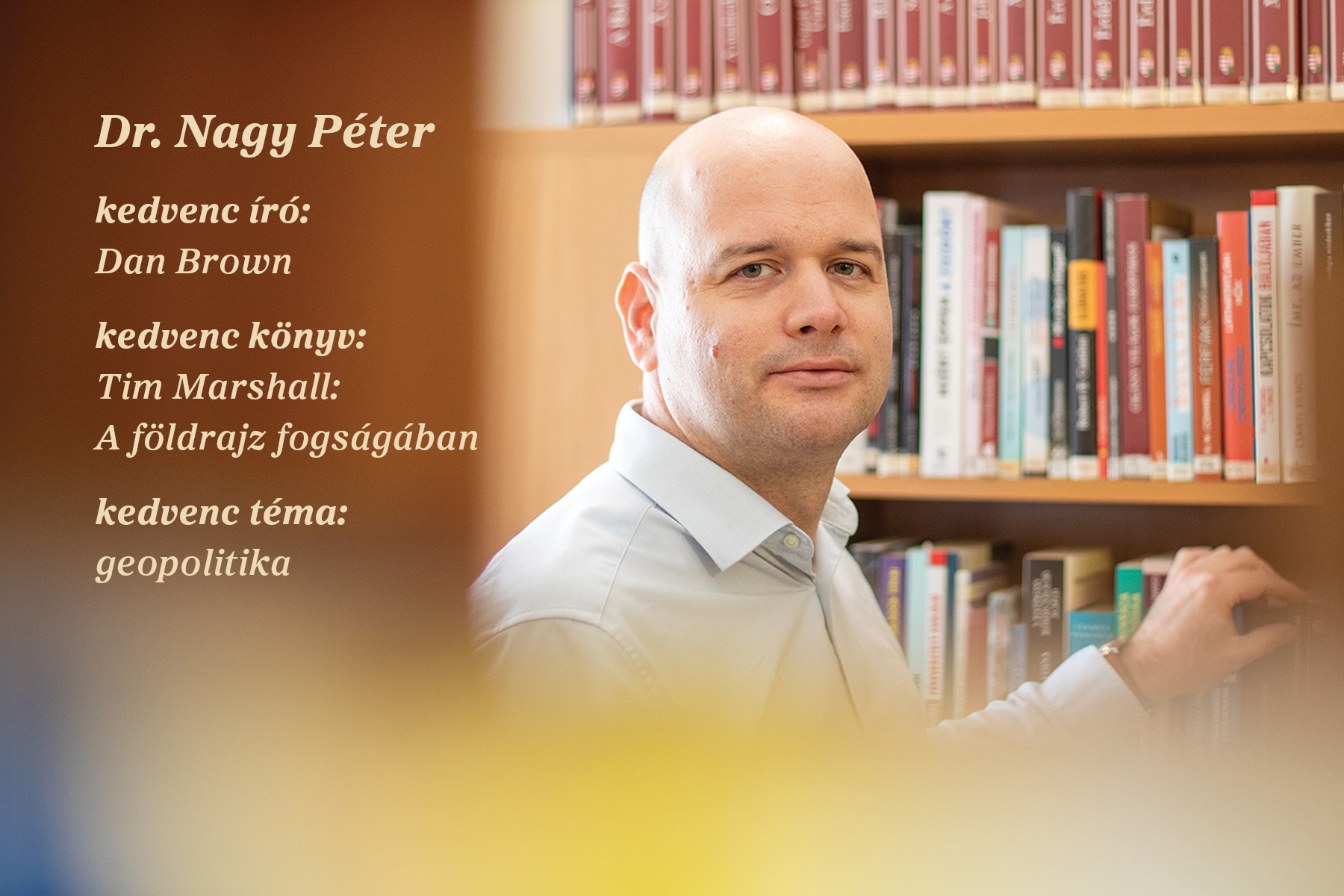 – Számomra alapművek Tim Marshall írásai. A földrajz fogságában és A földrajz hatalma című könyvei nagyon jól bemutatják, hogy egyes országok cselekvéseit, törekvéseit hogyan befolyásolja történelmük, földrajzi elhelyezkedésük. Jobban átláthatóak így a világban zajló események. Az olvasás kritikus gondolkodást ad, örömmel tölt el, hogy értem, miként működik a világ – összegzi gondolatait Dr. Nagy Péter.
