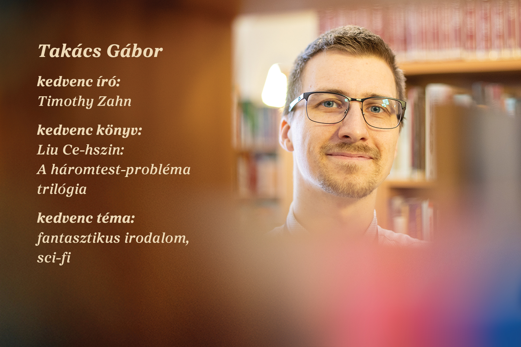 Nem az iskolai kötelezők maradtak meg Takács Gábor emlékeiben gyerekkorából, hanem amiket akkoriban a korosztálya is olvasott. A Harry Potter sorozattal már másodikosként találkozott, onnantól pedig nem volt megállás. Beiratkozott a paksi városi könyvtárba (itt készültek a fotók is cikkünkhöz – a szerk.), ahonnan kezdetben westernregényeket, ifjúsági fantasztikus irodalmat kölcsönzött, majd fokozatosan belekóstolt a science fictionbe, ami máig az egyik kedvence. – Azokat a műveket szeretem, amik megdolgoztatják a képzelőerőt az érzékletes leírásokkal, vagy ha éppen titokzatosan fogalmaznak és arra késztetnek, hogy én jöjjek rá dolgokra – fejtegeti. A sci-fik akkor tetszenek neki leginkább, ha váratlan, nagy fordulat van a végükön, amire az olvasmány kilenctizedénél még nem számít az ember. Egy jól megírt disztópikus könyv ki tudja belőle váltani az érzést: „de jó, hogy nem a leírt világban él!”